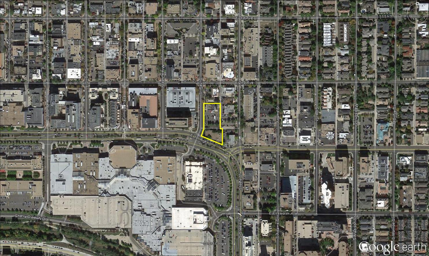 Today we are heading back over to Cherry Creek taking a look at another new project: 100 Saint Paul. The Pauls Corporation expects to break ground on a new 8-story building on the northeast corner of East First Avenue and Saint Paul Street. Here is a map with the project site outlined.