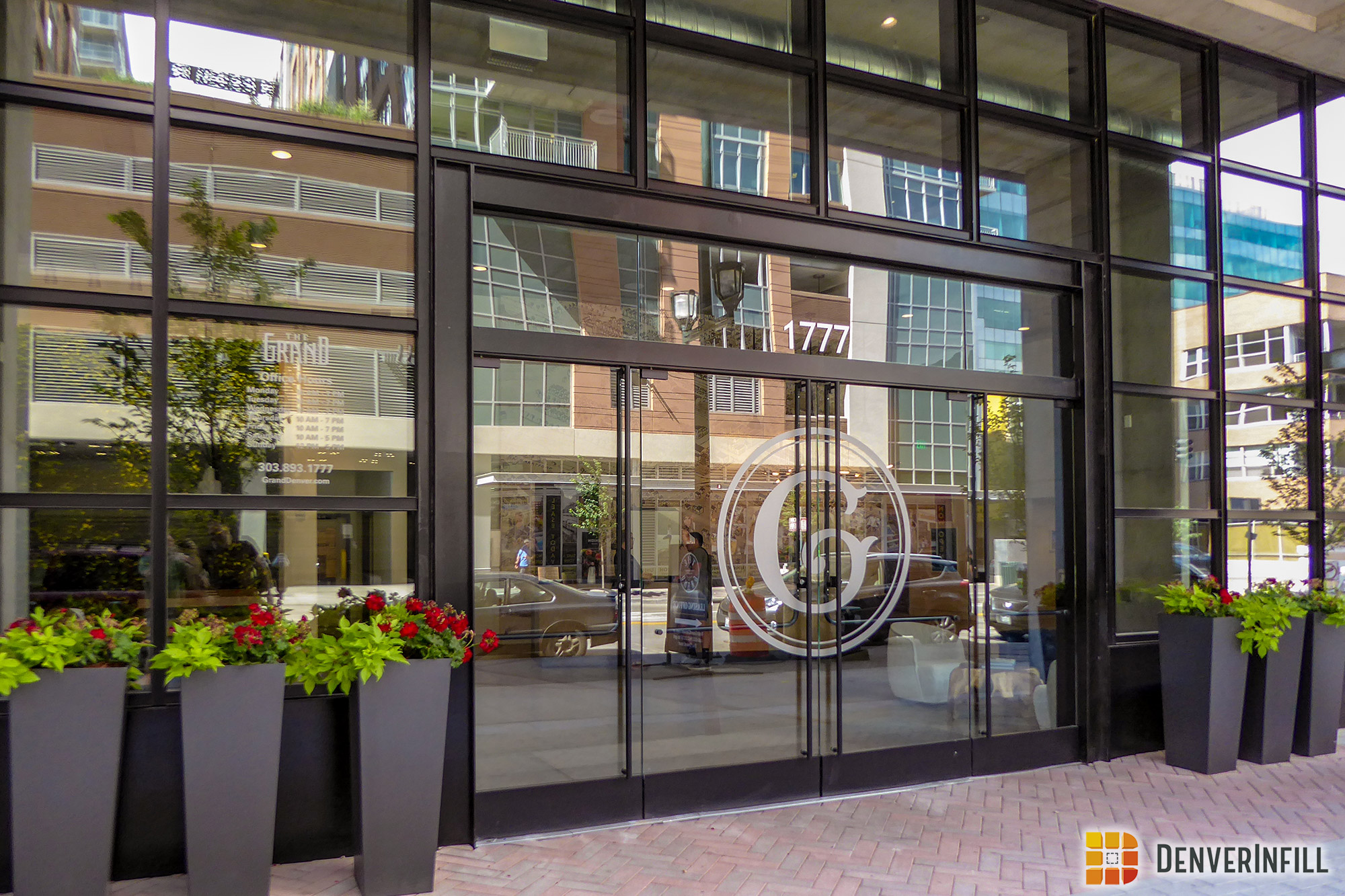 The 12-story tower on the 17th Street side sits across the street from Whole Foods and includes a large retail space at the corner. The L-shaped configuration of the Grand is evident from the Union Station light rail platforms and from the Millennium Bridge.