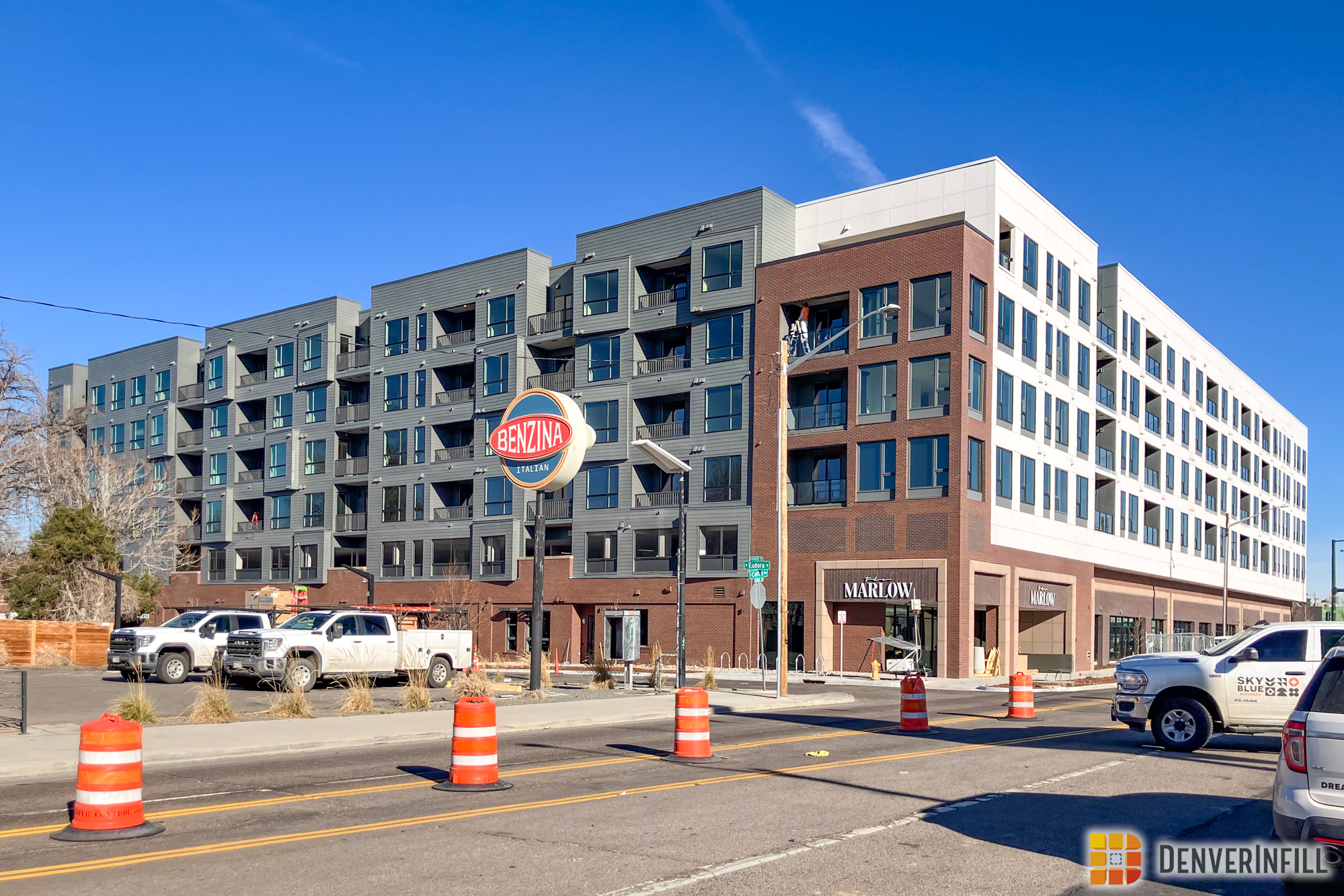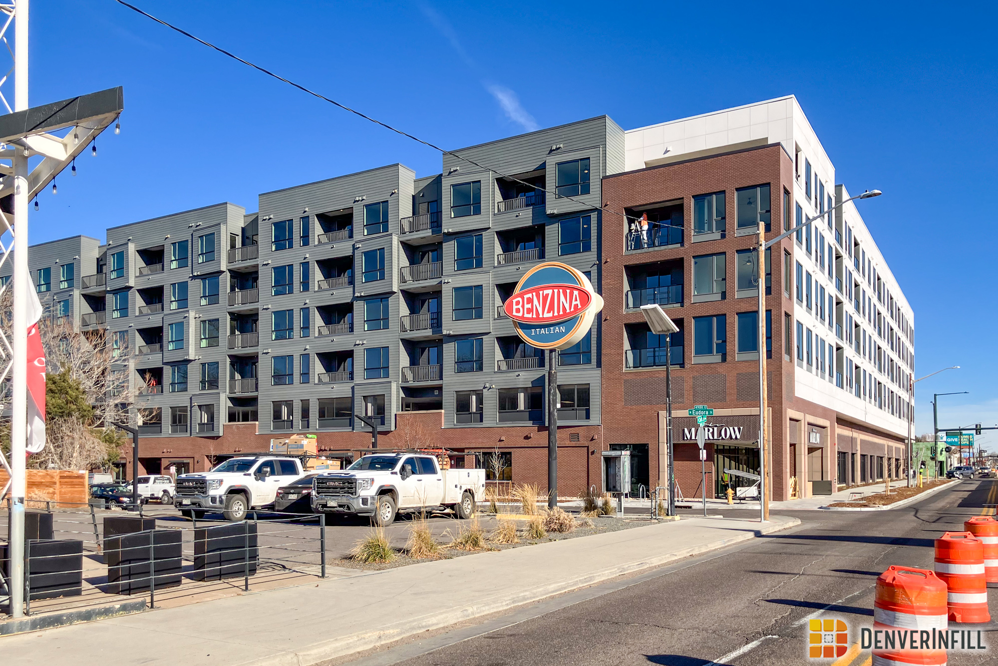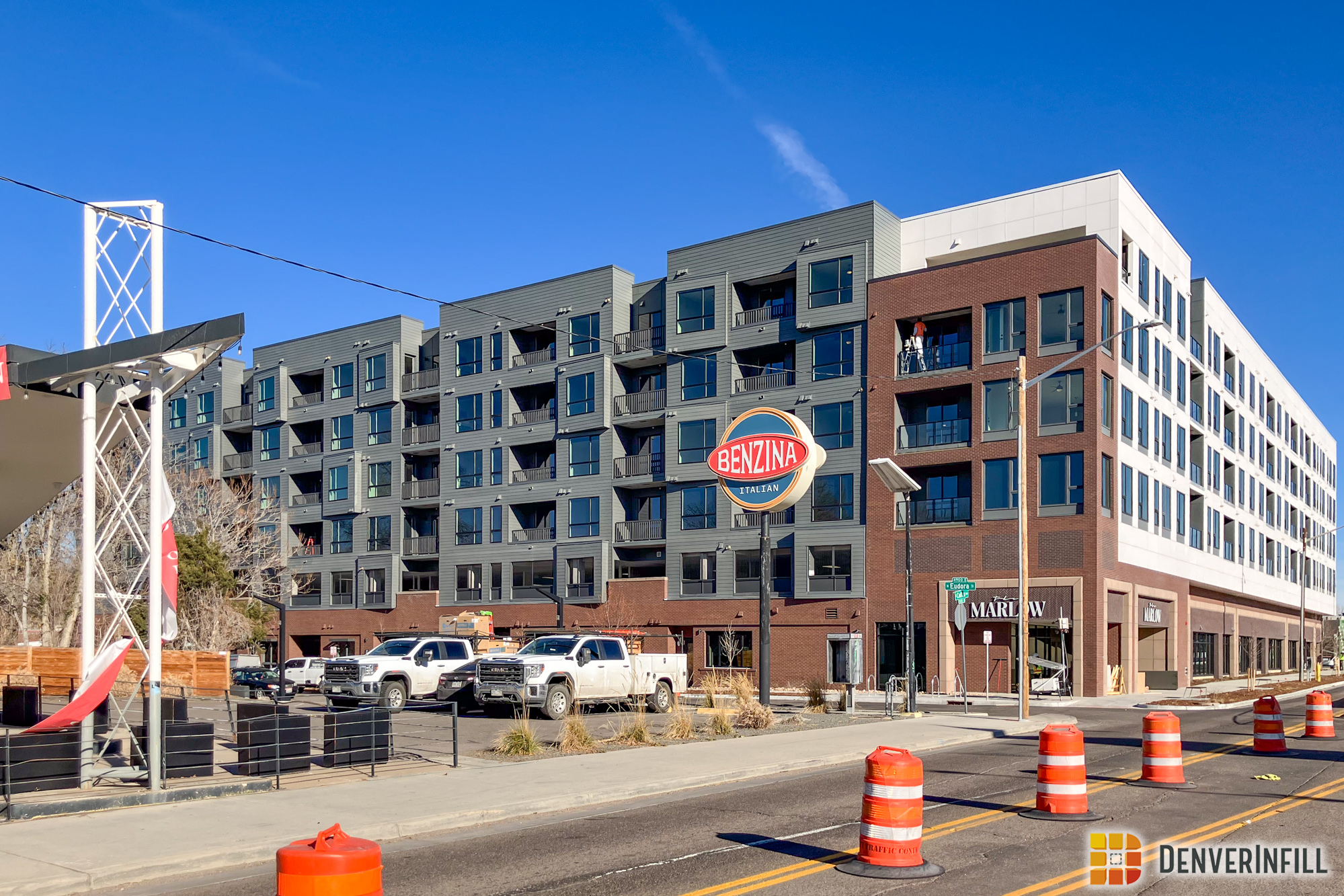The Marlow. One of only a couple large multifamily projects underway east of Colorado Boulevard but within the I-70 and I-25 highways, the Marlowe is close to Marzwyk’s fine foods, at the site of a BRT stop, and brings new multi-family availability to South Park Hill, a neighborhood that, in a recent analysis of Denver Census data, had among the lowest new residents move there of any neighborhood in the city. The northwestern edge of the lot will gain a small community garden, but that will not get much light because it is covered up by the building from the south. Still, it’s a nice idea, and interesting to see the large-scale multifamily model come to South Park Hill. There are many more lots that would suit the treatment!