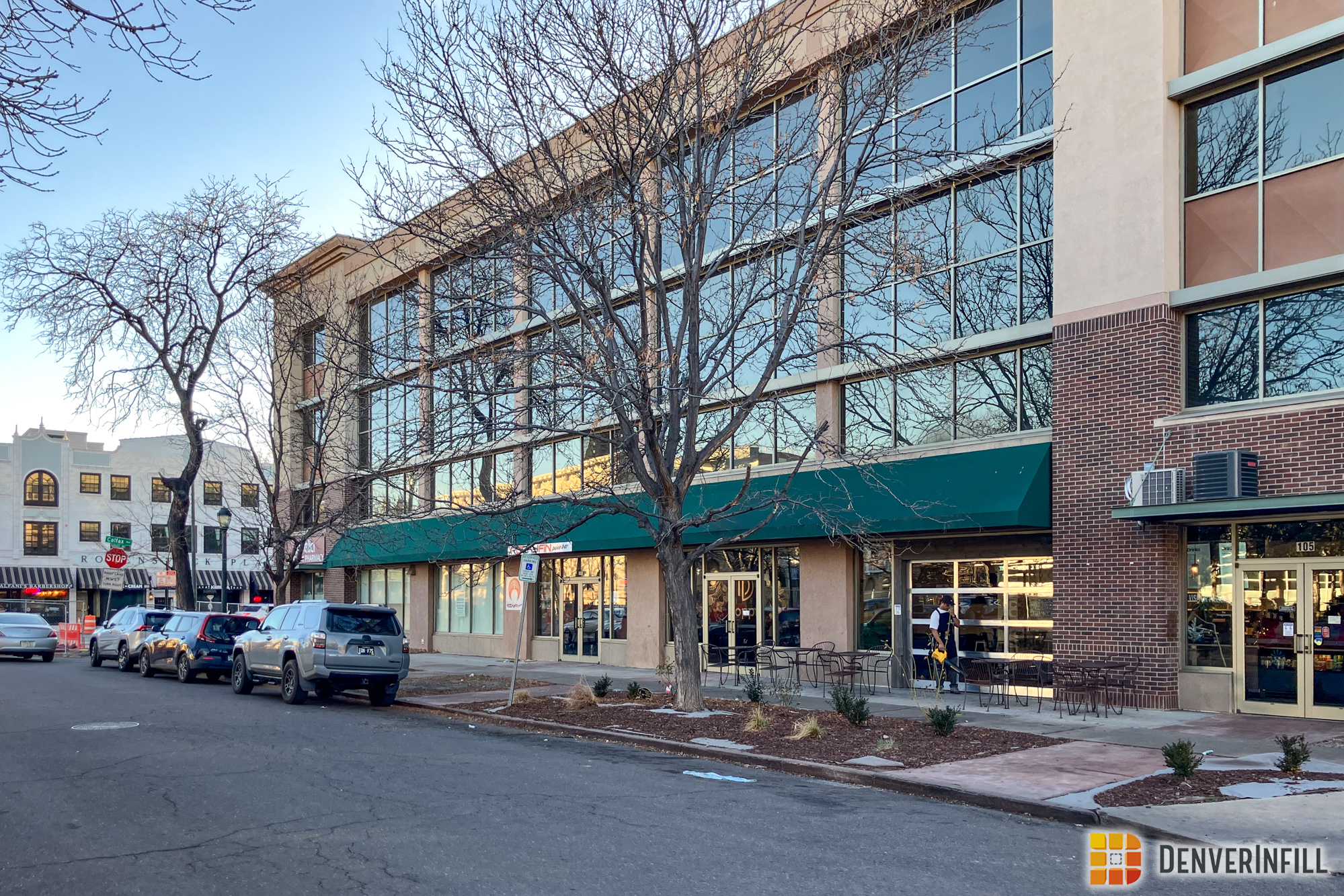 1245 E Colfax. Tucked behind an existing office building on the north side of Lafayette Street, there’s a dead boring little parking lot. Not for long! Where this parking lot is today, a new five-story apartment building will be constructed. The old office building at the corner of Lafayette and Colfax will be converted to residential use on the upper stories, leaving retail on the ground floor. These new homes would be close to both the Colfax-Downing and Colfax-Park BRT stations, plus the existing retail spaces on the first floor are proposed to stay throughout construction.